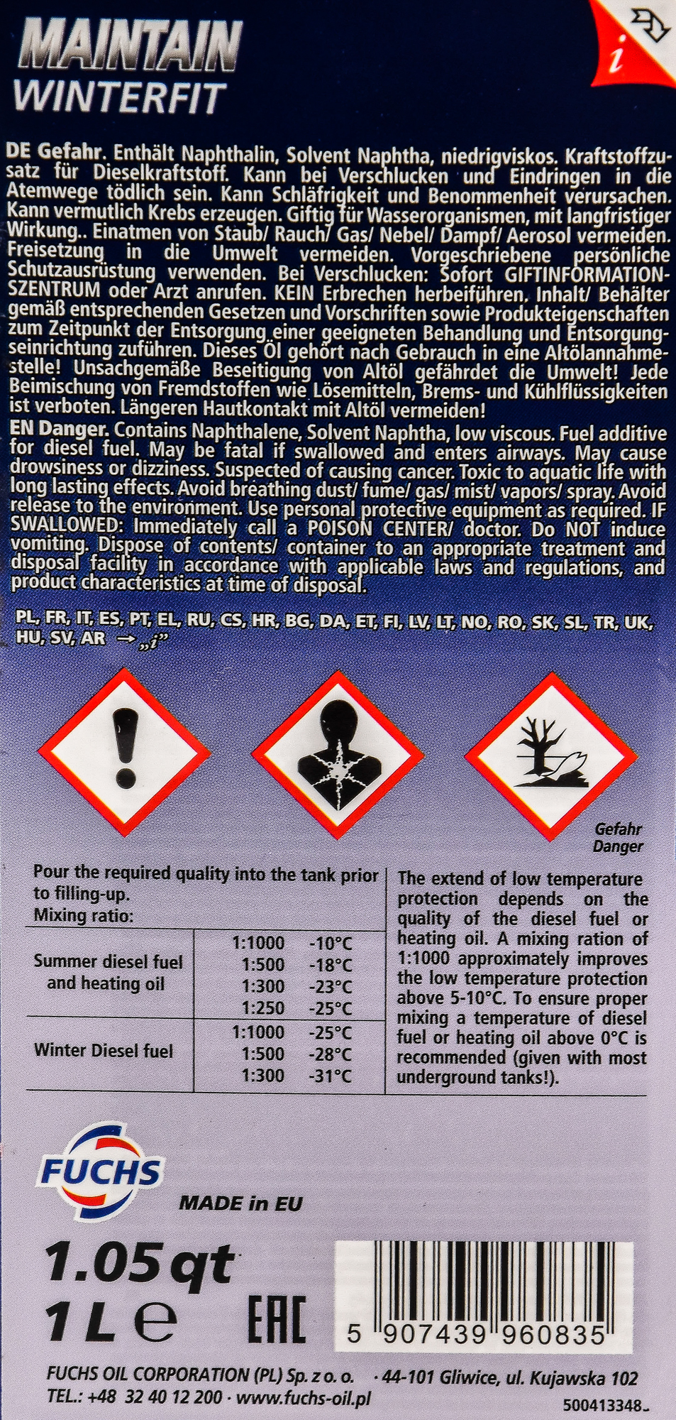 Технічні характеристикиАнтигель для дизеля maintainwinterfit1l FUCHS