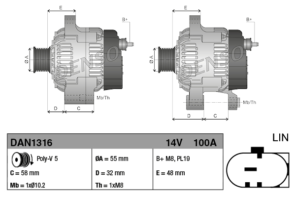 Технічні характеристикиГенератор DAN1316 DENSO